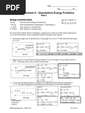 Unit 3 worksheet 3 quantitative energy problems energy constants 1 120 334 heat of fusion h melting or freezing 2260 j g heat of vaporization hv evaporating or condensing 2 1 j g0c heat capacity c of solid water 4 18 j g0c heat capacity c of liquid water heat equations q mcat q mhf q mhv. Worksheet can be utilized for revising this issue for assessments recapitulation helping the students to be aware of the subject more precisely or or improve the information. Unit 3 worksheet 5 is the fifth workbook i ve written on quantitative energy problems. Unit 3 worksheet 3 quantitative energy problems answers.